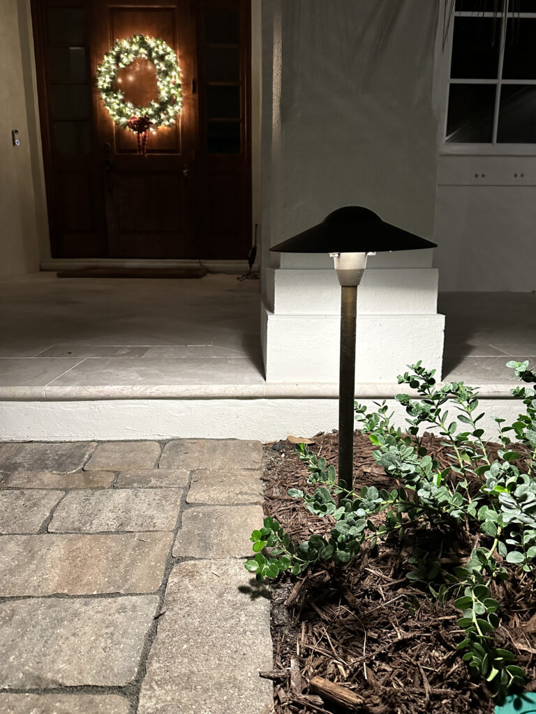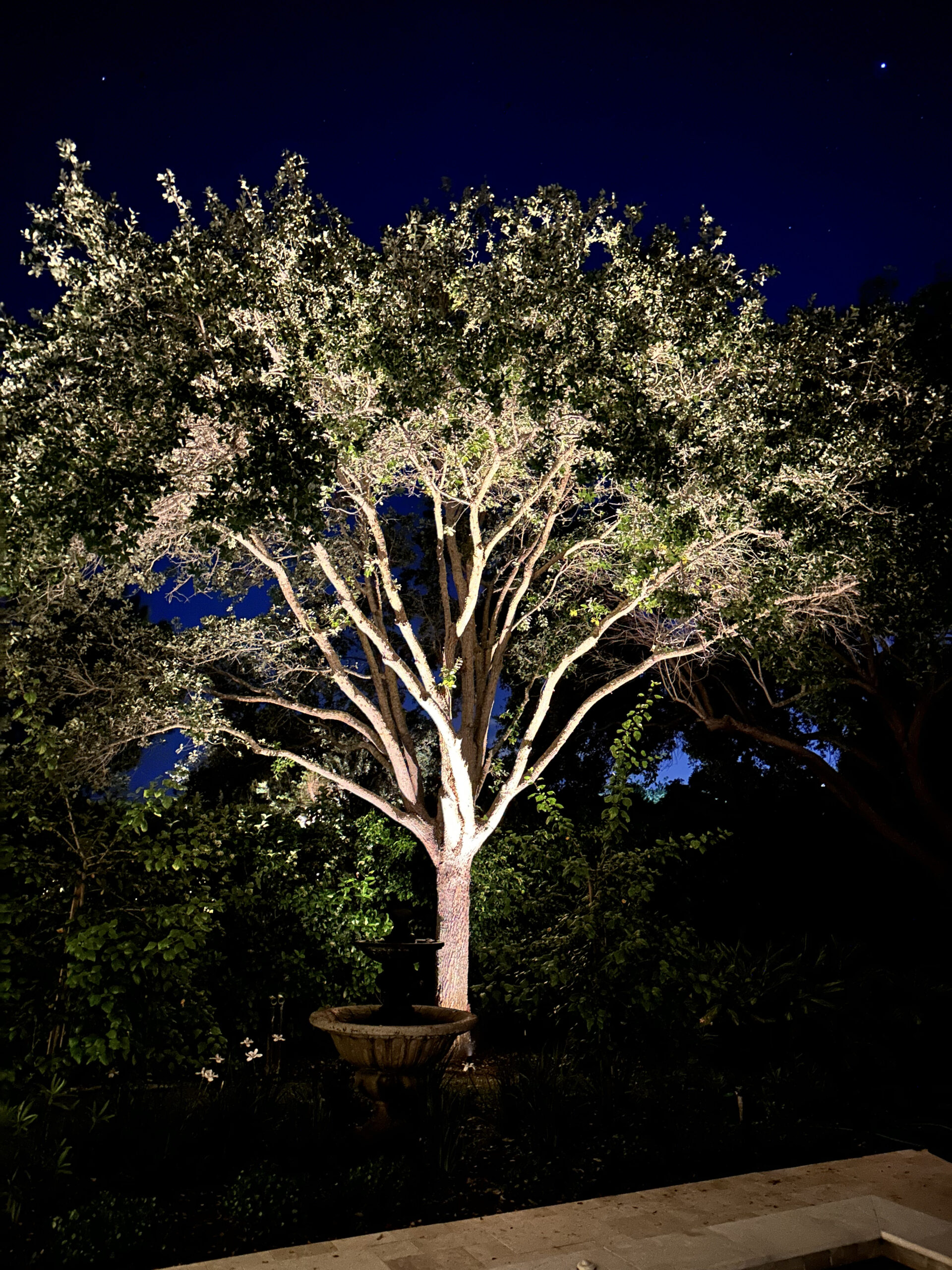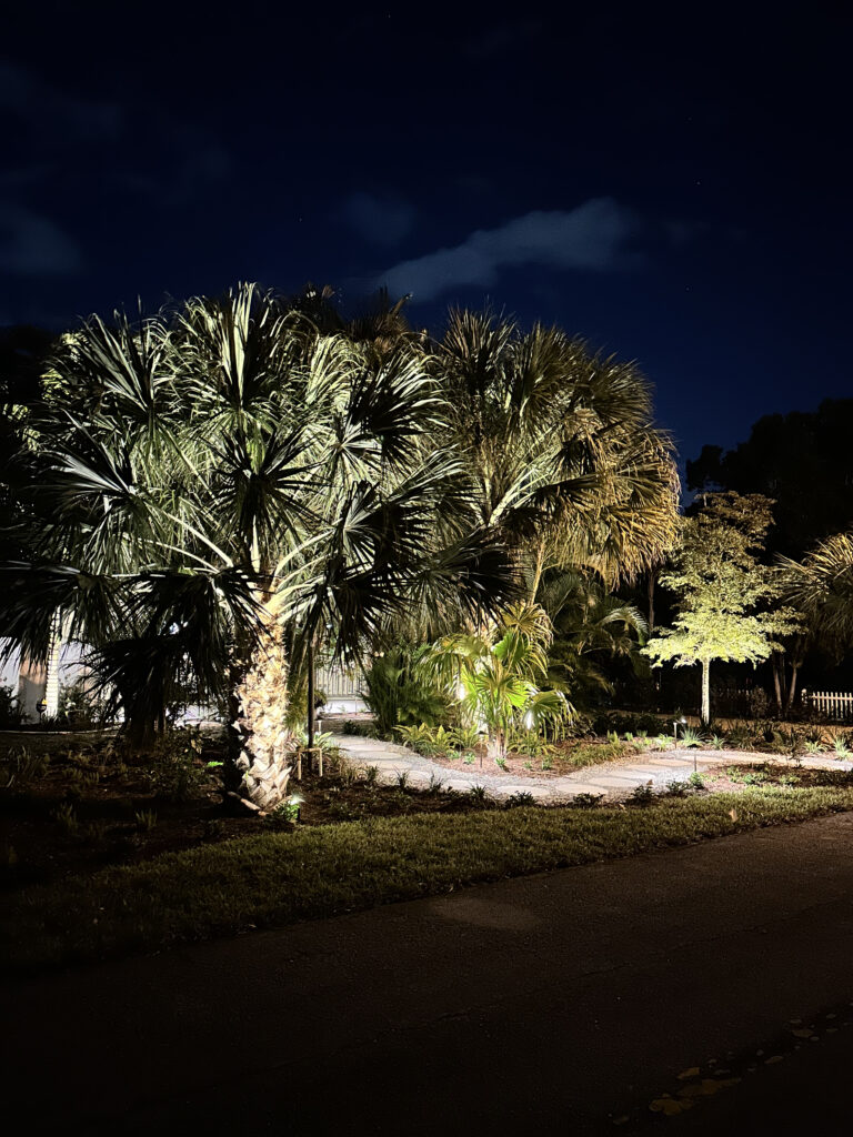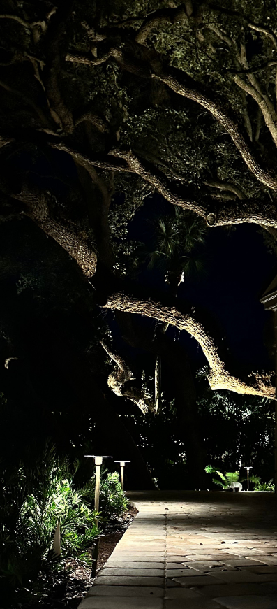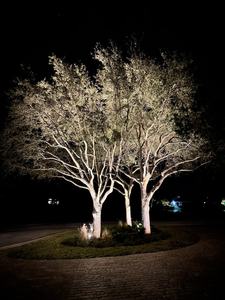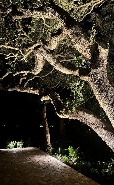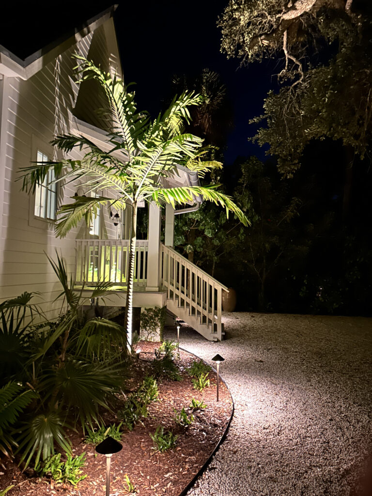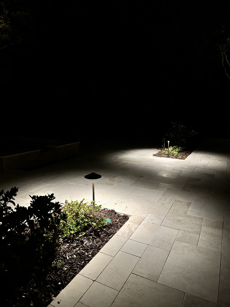 Eventide Lighting Company designed the lighting to complement the new landscape and bring the property to life after dark. Solid brass path lights line the front of the home, while brass uplights highlight the trees and planting areas. A large oak in the front lawn and another oak in the side yard, whose form almost resembles a weeping willow, are gently illuminated and give the property a warm presence at night. The lighting ties the landscape and architecture together, creating a soft glow that the homeowner especially enjoys.