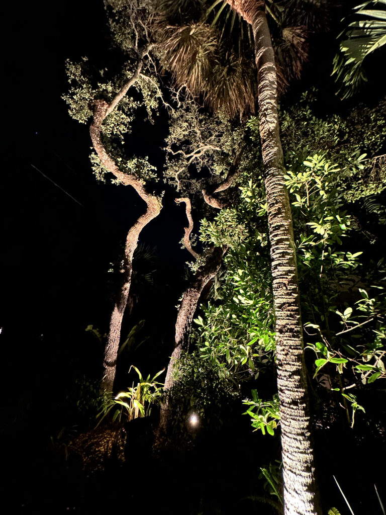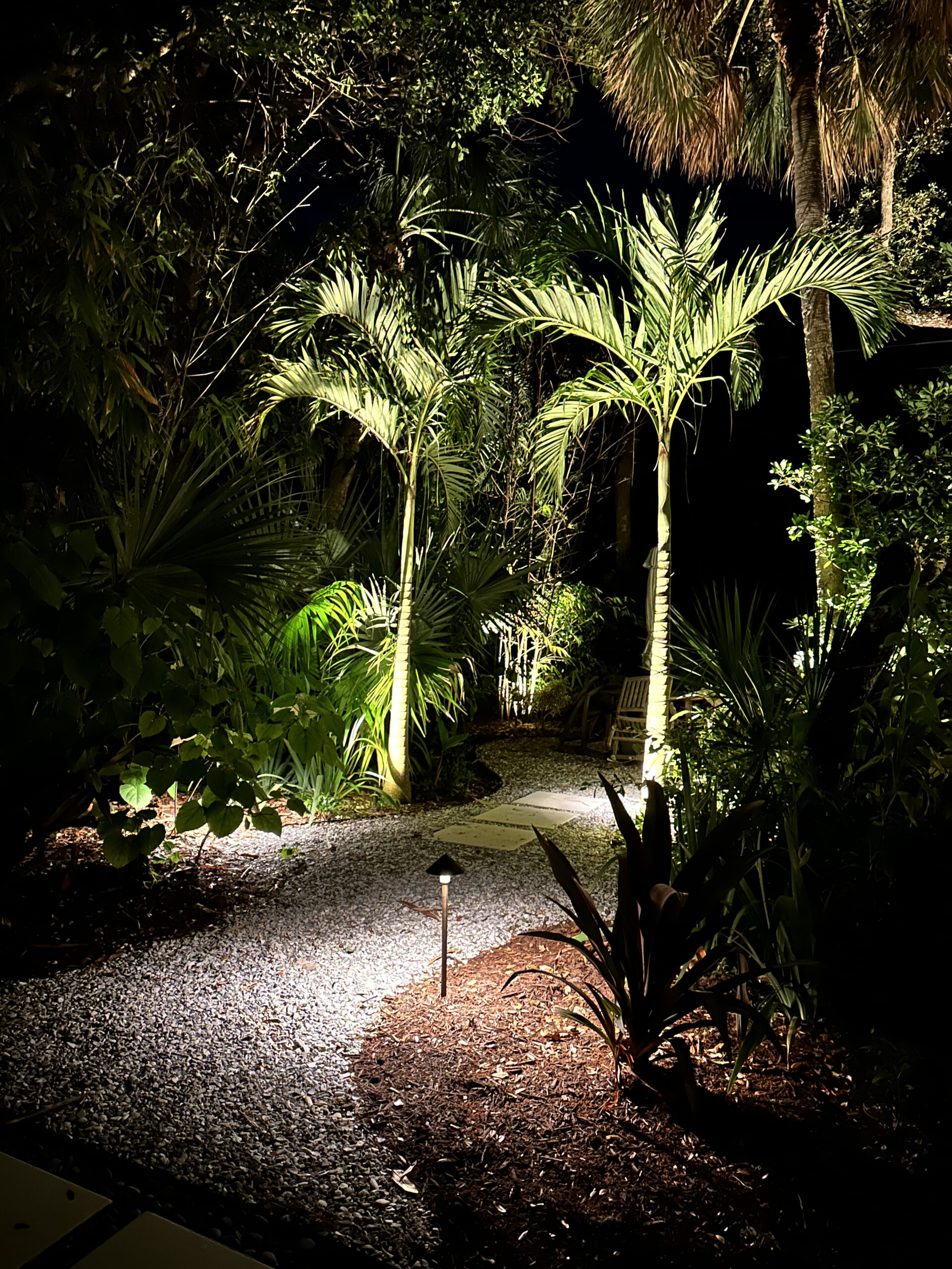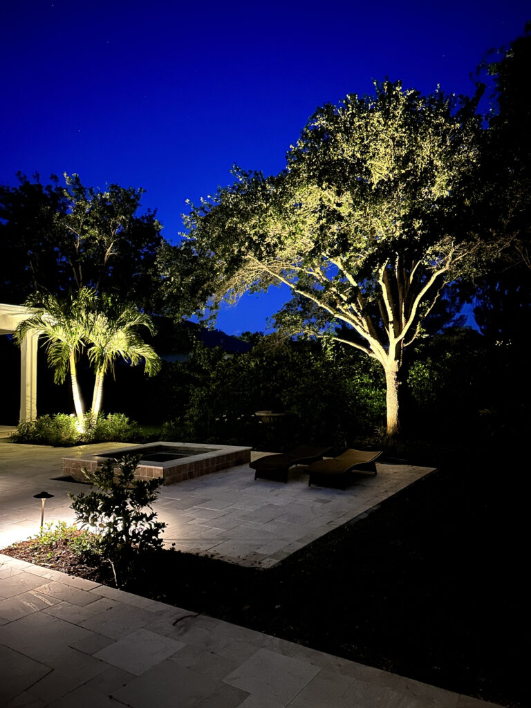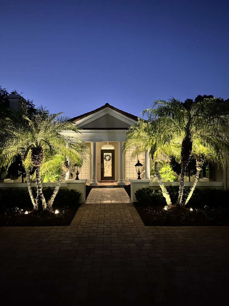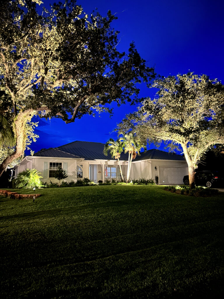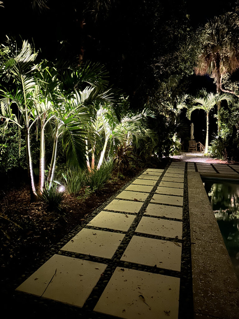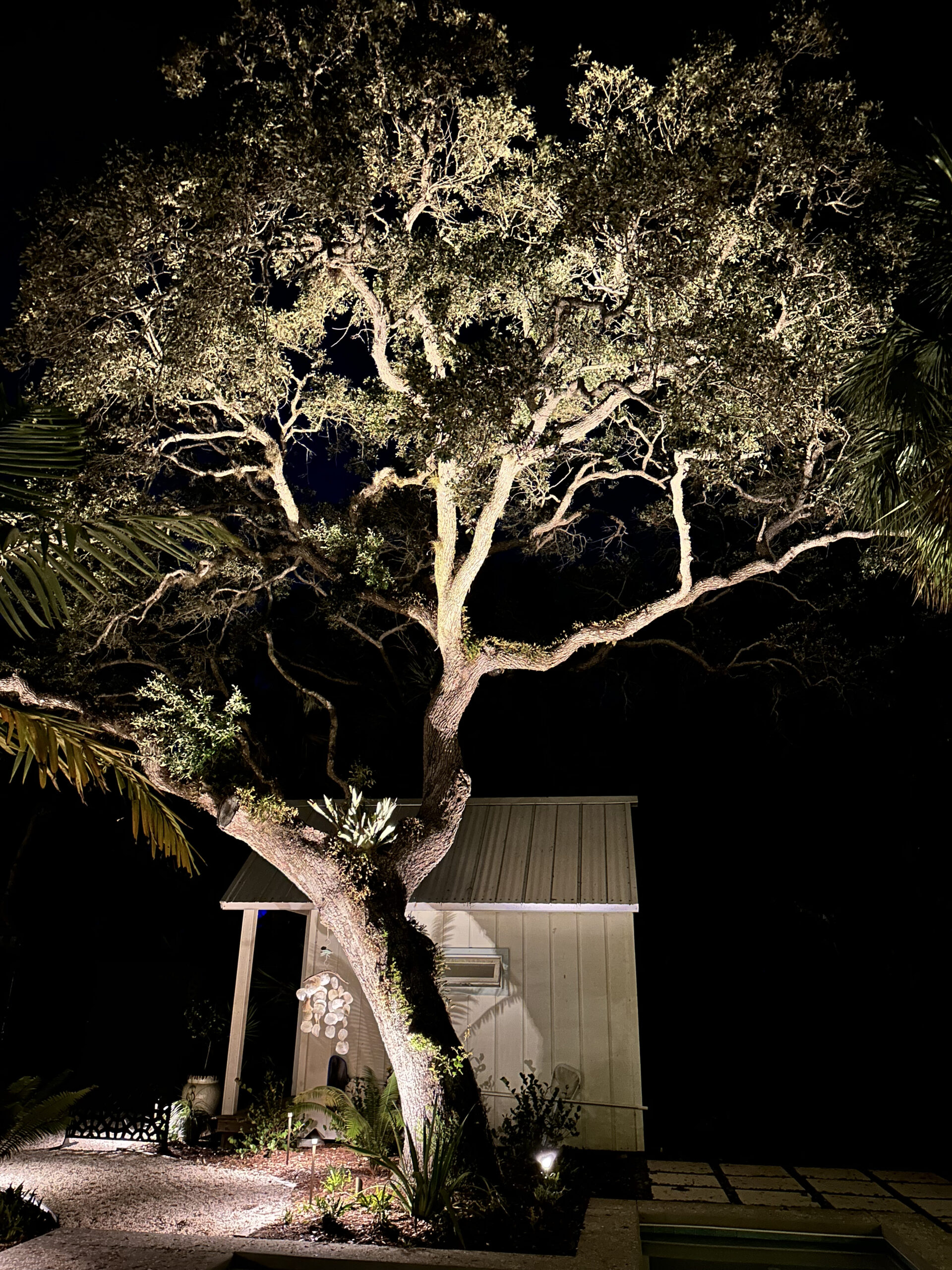 Eventide Lighting Company designed the lighting to complement the new landscape and bring the property to life after dark. Solid brass path lights line the front of the home, while brass uplights highlight the trees and planting areas. A large oak in the front lawn and another oak in the side yard, whose form almost resembles a weeping willow, are gently illuminated and give the property a warm presence at night. The lighting ties the landscape and architecture together, creating a soft glow that the homeowner especially enjoys.