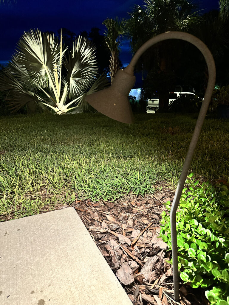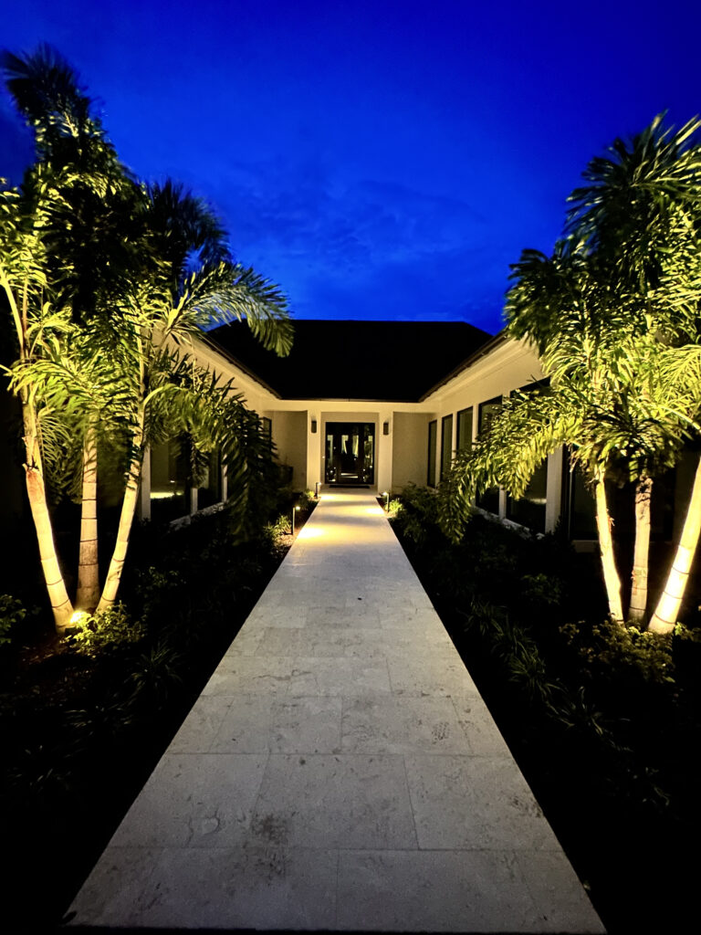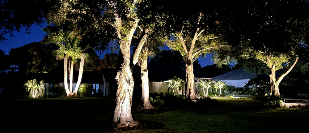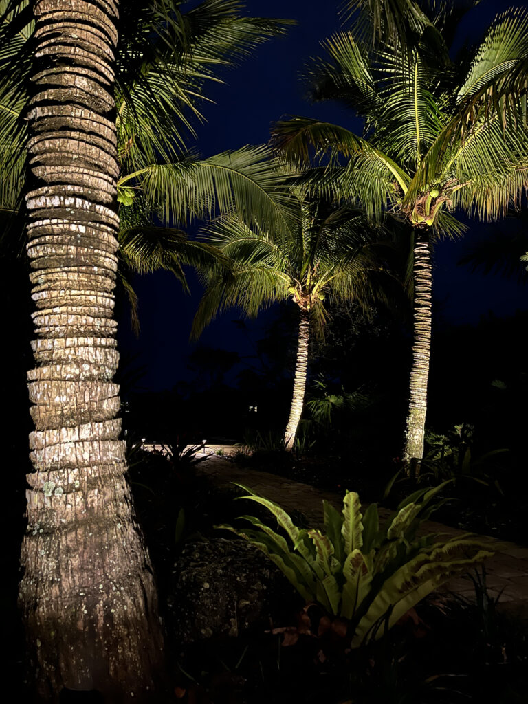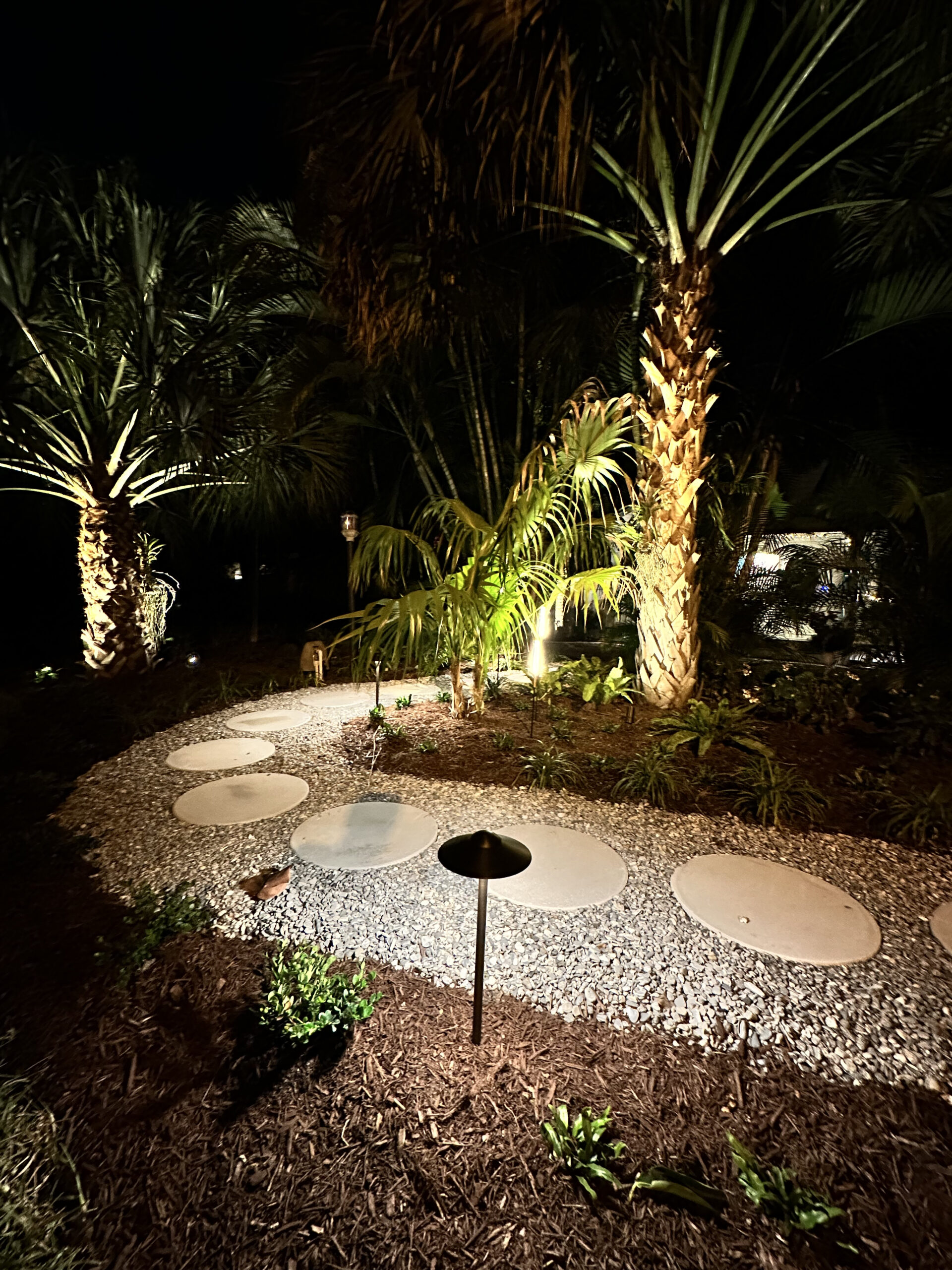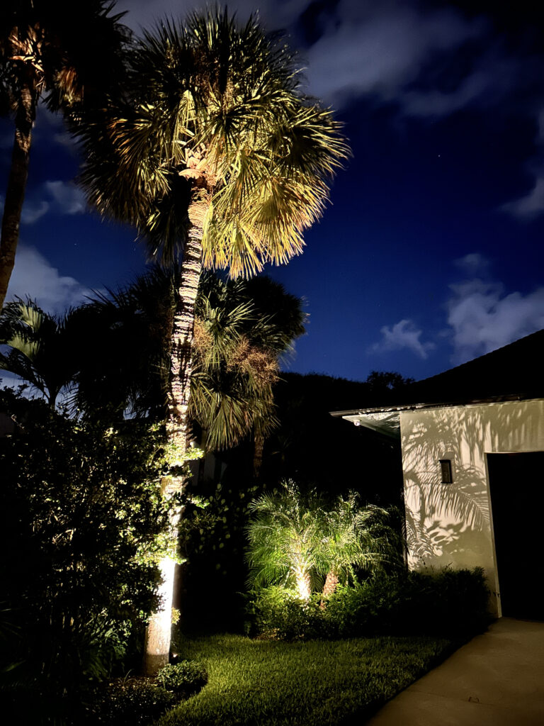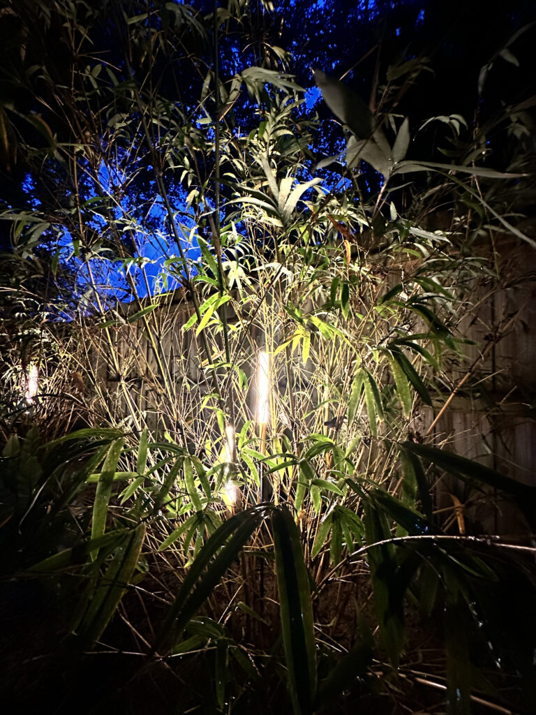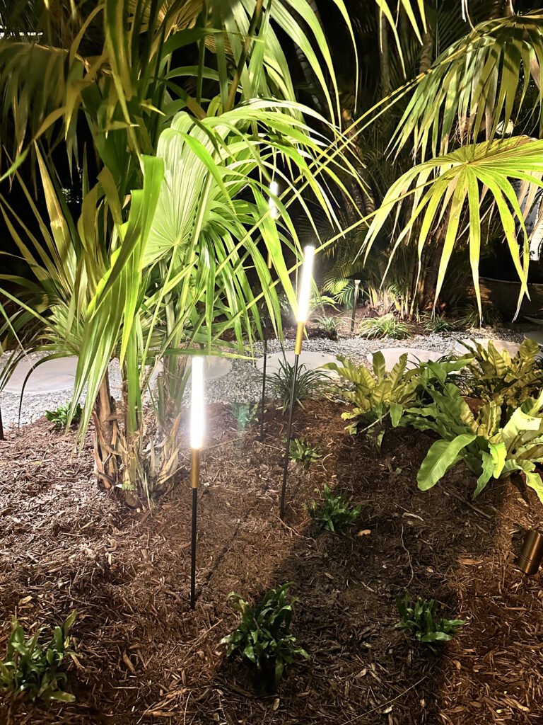 Eventide Lighting Company designed the lighting to complement the new landscape and bring the property to life after dark. Solid brass path lights line the front of the home, while brass uplights highlight the trees and planting areas. A large oak in the front lawn and another oak in the side yard, whose form almost resembles a weeping willow, are gently illuminated and give the property a warm presence at night. The lighting ties the landscape and architecture together, creating a soft glow that the homeowner especially enjoys.