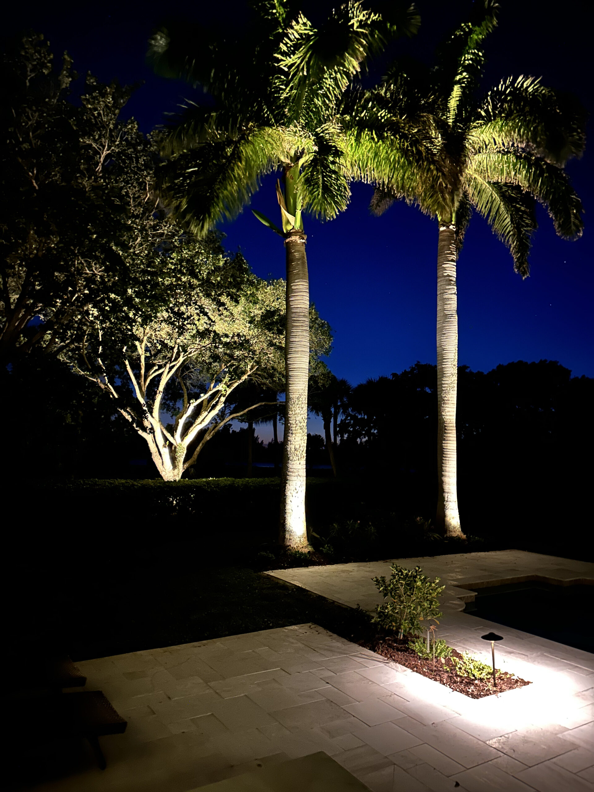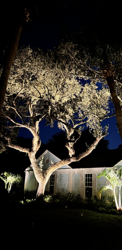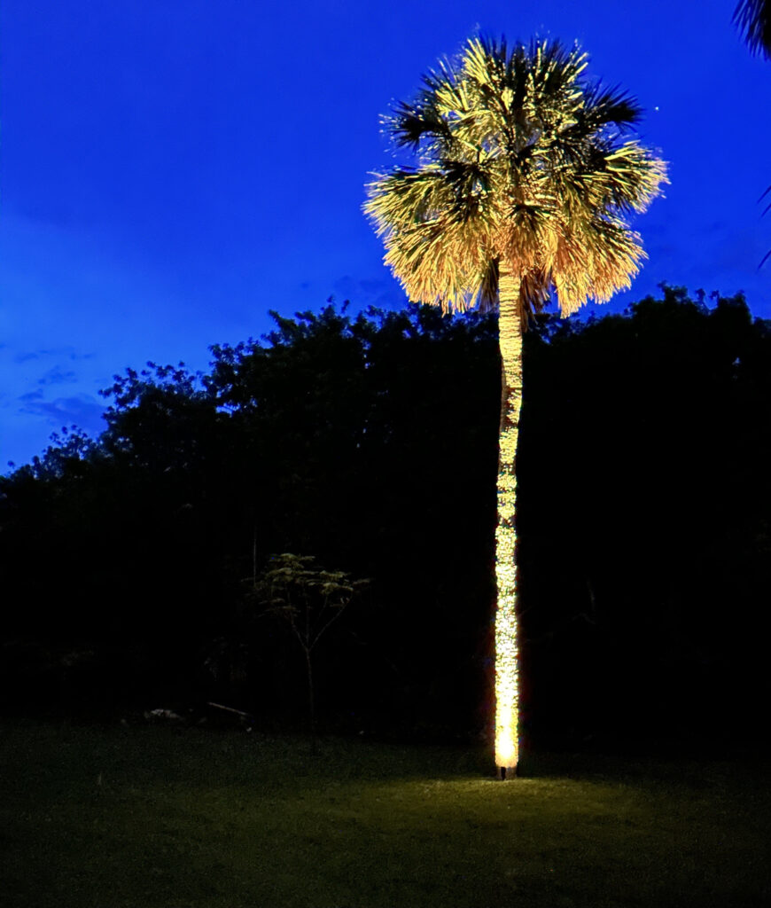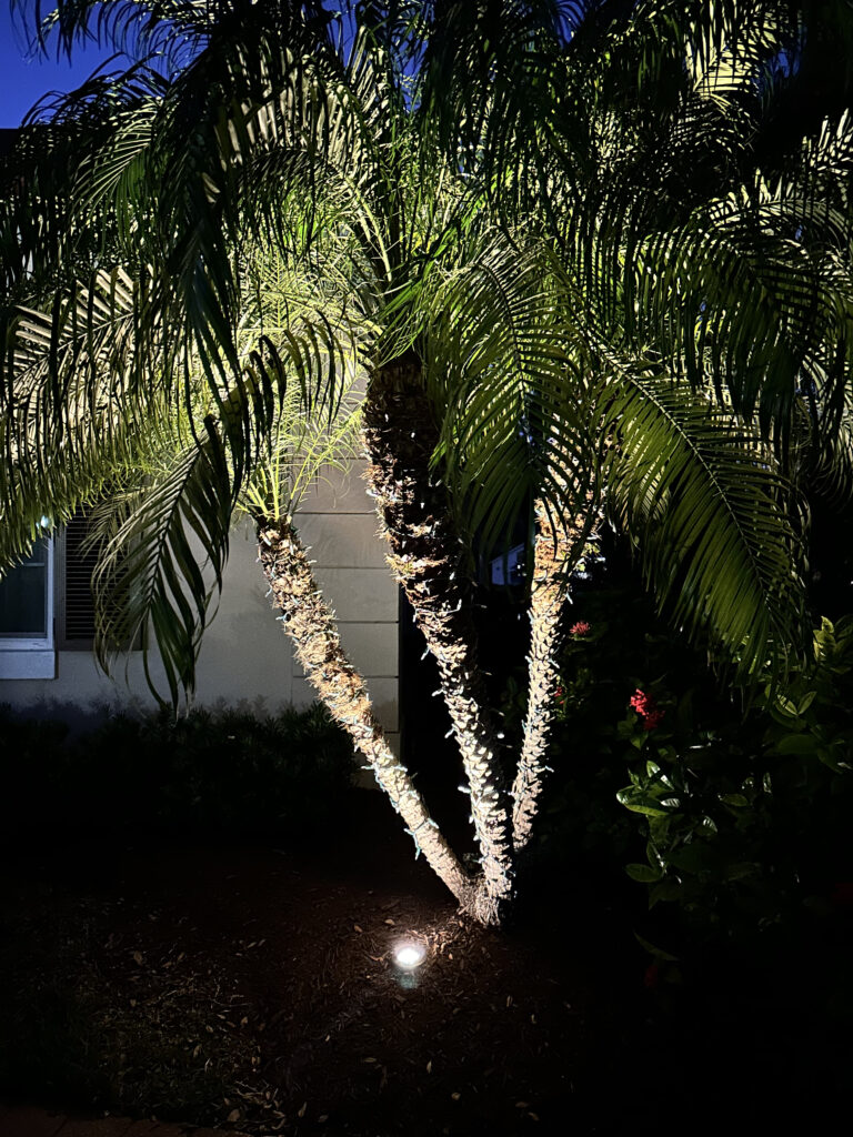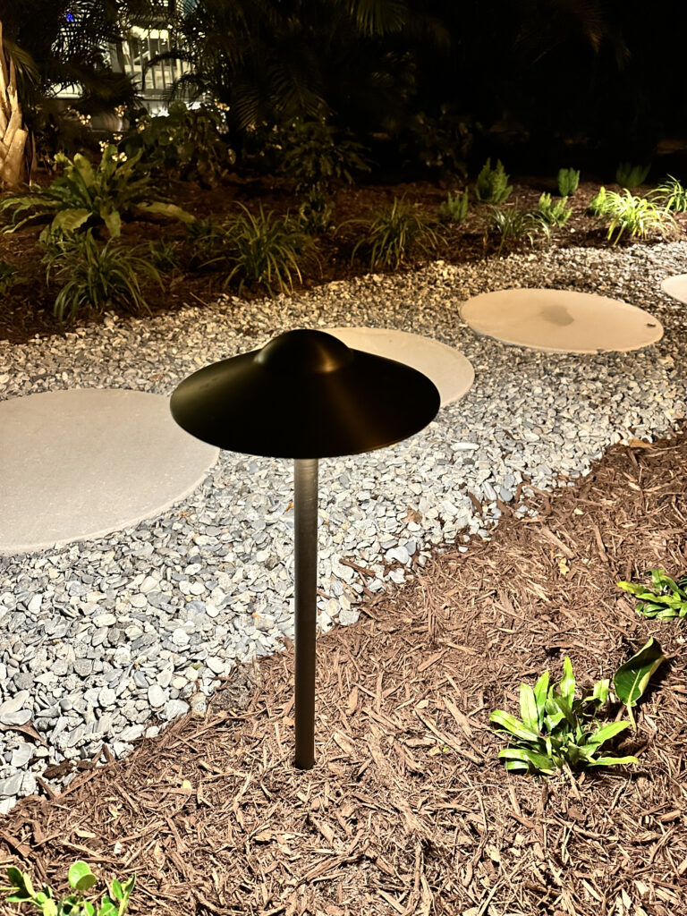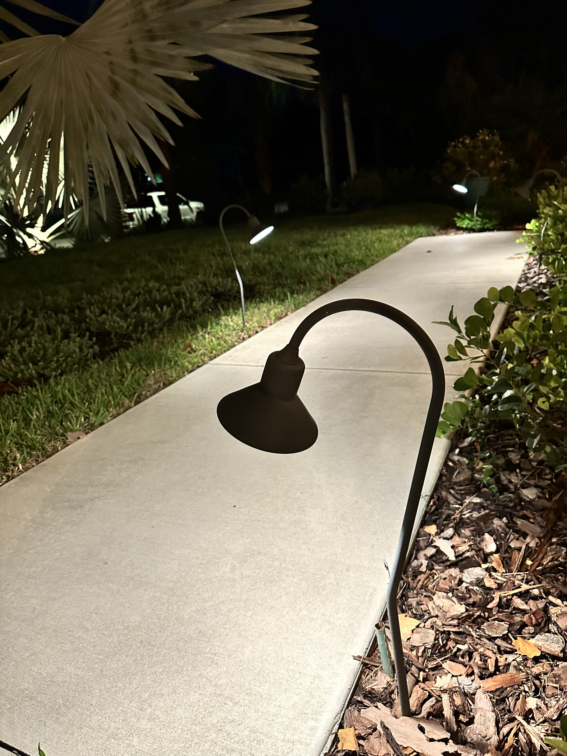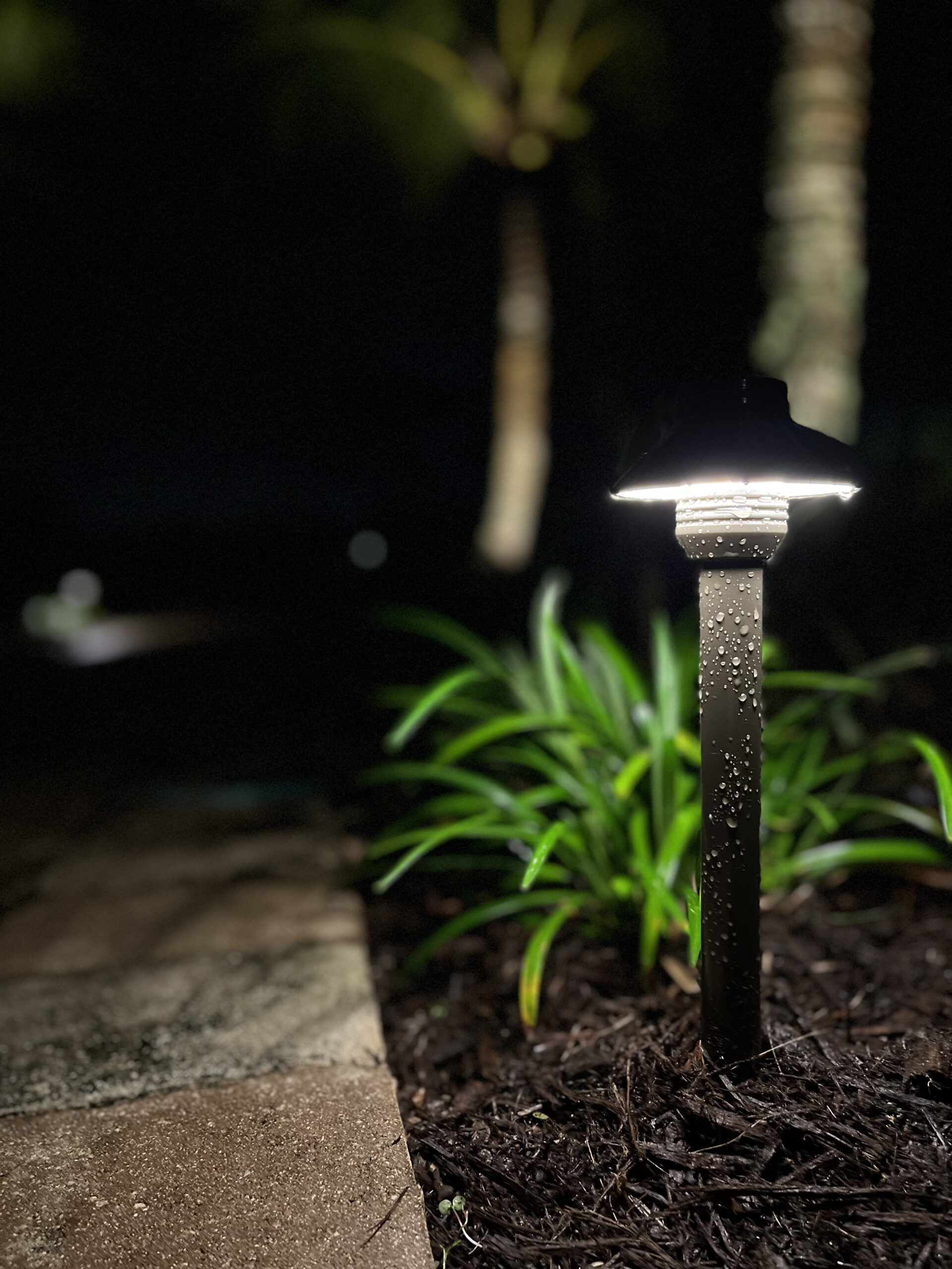 Eventide Lighting Company designed the lighting to complement the new landscape and bring the property to life after dark. Solid brass path lights line the front of the home, while brass uplights highlight the trees and planting areas. A large oak in the front lawn and another oak in the side yard, whose form almost resembles a weeping willow, are gently illuminated and give the property a warm presence at night. The lighting ties the landscape and architecture together, creating a soft glow that the homeowner especially enjoys.